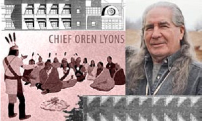 Since his return to Onondaga, Chief Lyons has been a leading advocate for American Indian causes. He is recognized not only in the United States and Canada but internationally as an eloquent and respected spokesperson on behalf of Native Peoples. He is internationally renowned as an environmental and human rights advocate, and sought for his expertise on American Indian traditions, Indian law and history, and interfaith dialogue. For over fifteen years, he has taken part in the meetings of Indigenous Peoples held in Geneva under the auspices of the Human Rights Commission of the United Nations, and helped to establish the Working Group on Indigenous Populations in 1982. He serves on the Executive Committee of the Global Forum of Spiritual and Parliamentary Leaders on Human Survival, and is a principal figure in the Traditional Circle of Indian Elders, an annual council of traditional grassroots leadership of the major Indian nations of North America.