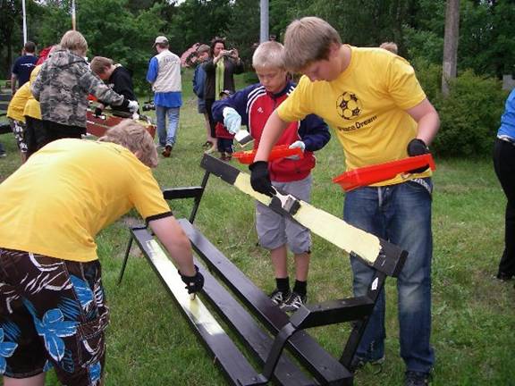 A second project involved helping to paint benches and garden objects in an old people’s home in Parnu. The director of the home was amazed by the enthusiasm of the players. Teams from Ukraine, Finland and Estonia were involved. Parents and organizers helped. The vice-mayor of Parnu also attended, and was very supportive. The home provided ice cream and drinks to the volunteers. It was a great experience for all involved.